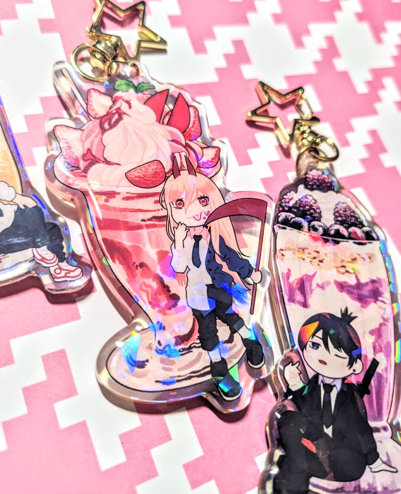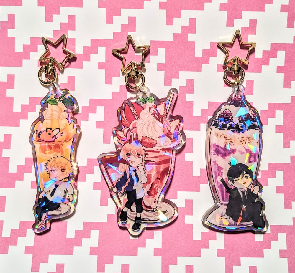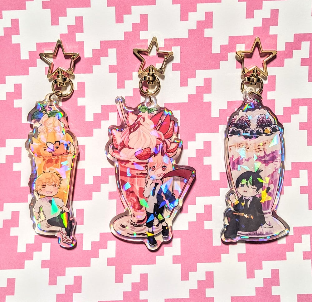 Double-sided 3.5" holographic broken glass epoxy coated acrylic charms of characters from Chainsaw Man. With the clasp included, the overall charm is 5". Denji has a mango parfait, Power is strawberry, and Aki is blueberry!