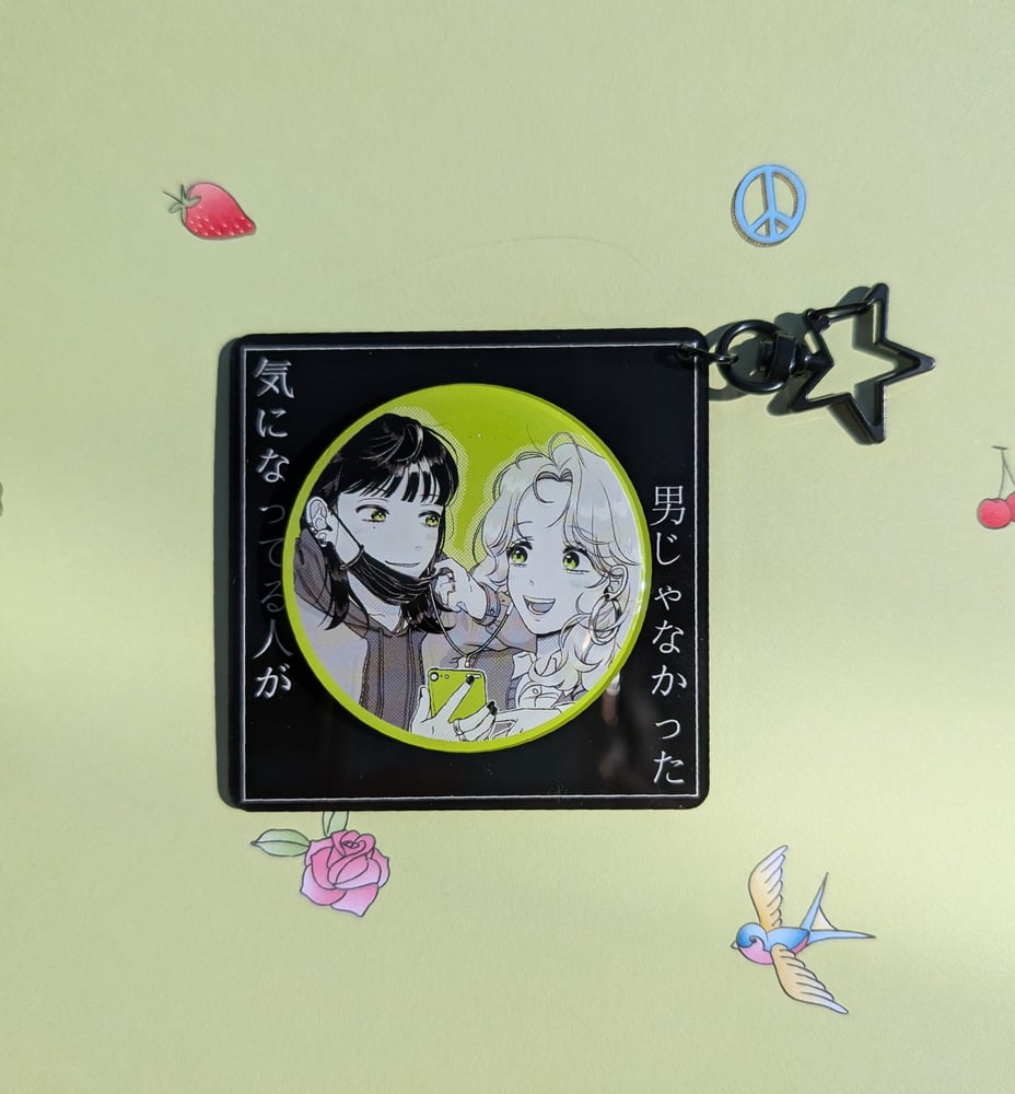 Acrylic spinning charm!! It's quite delicate so display with caution, not recommended for outdoor everyday wear on bags.
